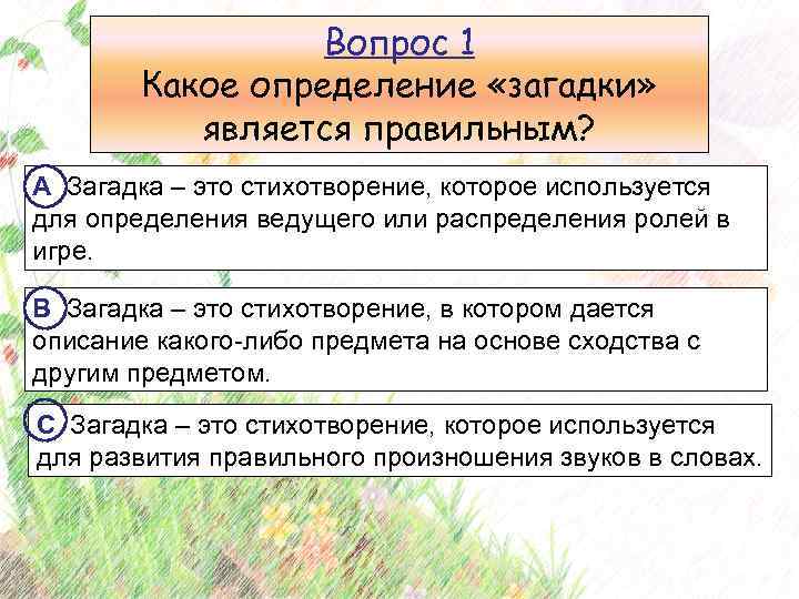 Вопрос 1 Какое определение «загадки» является правильным? А Загадка – это стихотворение, которое используется для определения ведущего или распределения ролей в игре. В Загадка – это стихотворение, в котором дается описание какого-либо предмета на основе сходства с другим предметом. С Загадка – это стихотворение, которое используется для развития правильного произношения звуков в словах.