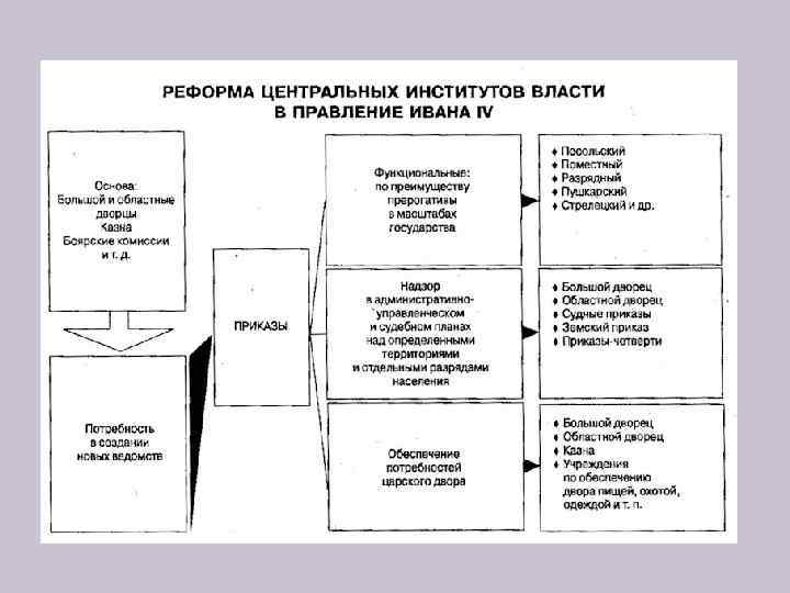 Реформы Ивана IV и Избранной рады. Военные: 1. Ограничение местничества 2. Создание избранной 1000 3. Создание регулярной армии (стрельцы) 4. Уложение о Службе 5. Создание чиновничьего руководства армии Народные: 1. Введение нового Судебника (1497 год. ) 2. Налоговая реформа (1556 год. ) 3. Отмена подсудности дворян (1549 год) 4. Была составлена Дворцовая тетрадь (1551 -1552 гг. ) Церковная: 1. Стоглавый собор - ликвидация неподсудности духовенства царскому суду - избрать “беспорочных” священников и игуменов - получение земель монастырями только с разрешения царя Управления: 1. Ликвидация систем кормления (1555 -1556 гг. ) 2. Формирование приказов (1553 – 1556 года) 3. Губная реформа (18 января 1555 г. ) 4. Принято составление Государева родословца (1555 г. )