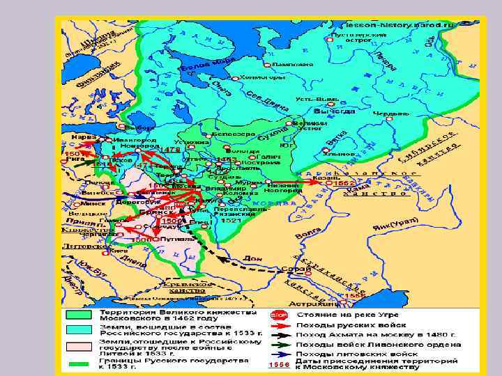 Военные действия Цель: расширение территории за счет присоединения земель, ранее принадлежавших древнерусскому государству. 1552 год — поход на Казань и присоединение Казанского ханства. 1556 год — завоевание Астраханского ханства. 1558 год — начало Ливонской войны (длилась 25 лет и была проиграна).