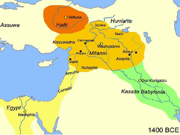 Egypt (green), Hatti (yellow), Babylon (purple), Assyria (grey), Mitanni (red), Achaean/Mycenaean (orange). Границы во время «Амарнского мирового порядка»