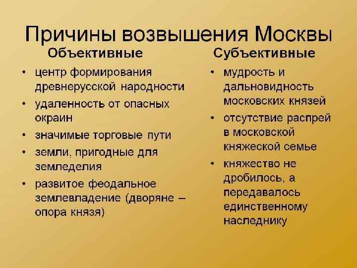 Причинами усиления Московского княжества были: 1. Выгодное экономикогеографическое положение. Москва находилась на оживленном торговом пути Прибалтика - Поволжье Средняя Азия и прибыльная хлебная торговля приносила в княжескую казну немалые доходы.