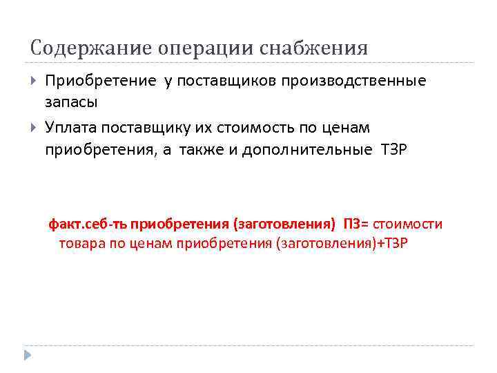 Содержание операции снабжения Приобретение у поставщиков производственные запасы Уплата поставщику их стоимость по ценам приобретения, а также и дополнительные ТЗР факт. себ-ть приобретения (заготовления) ПЗ= стоимости товара по ценам приобретения (заготовления)+ТЗР