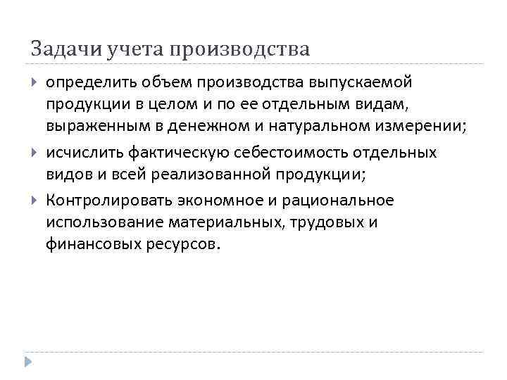 Задачи учета производства определить объем производства выпускаемой продукции в целом и по ее отдельным видам, выраженным в денежном и натуральном измерении; исчислить фактическую себестоимость отдельных видов и всей реализованной продукции; Контролировать экономное и рациональное использование материальных, трудовых и финансовых ресурсов.