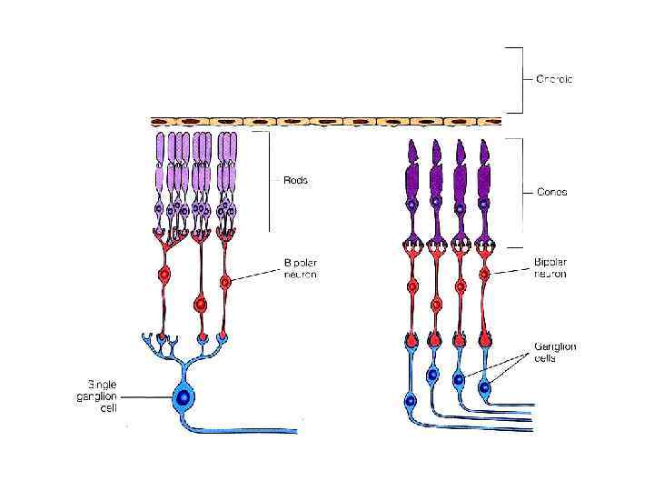 Нейральная часть сетчатки (без фоторецепторов) наружный синаптический слой горизонтальные, биполярные и амакриновые клетки внутренний синаптический слой ганглиозные клетки с аксонами