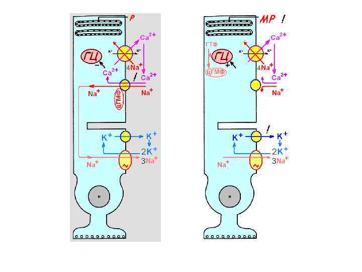 Синапс между сенсорными и биполярными клетками • On-биполяры растормаживаются (возбуждаются) – метаботропные рецепторы • Off -биполяры тормозятся – ионотропные рецепторы