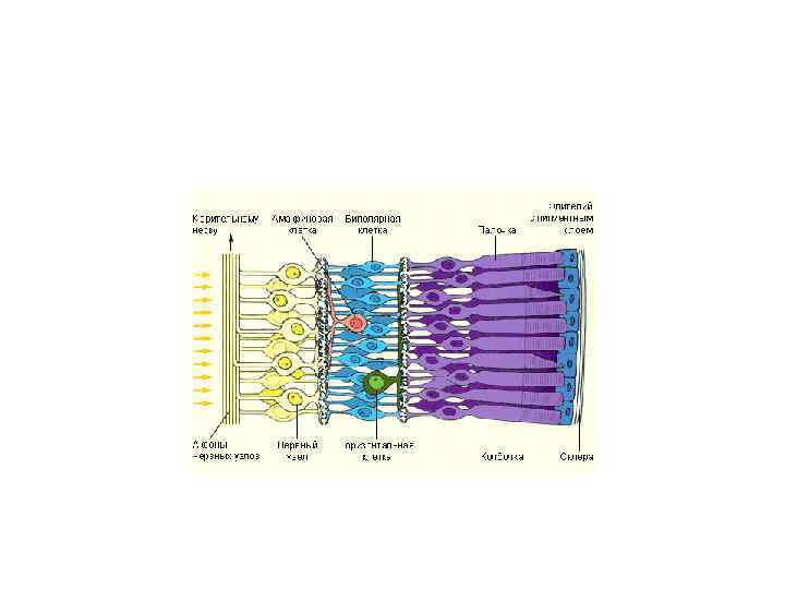 Клеточная организация сетчатки позвоночных Пигментный эпителий Слои наружных и внутренних сегментов палочек и колбочек Ядра биполярных, горизонтальных и амакриновых клеток Глиальная Мюллеровская клетка Ядра ганглиозных клеток