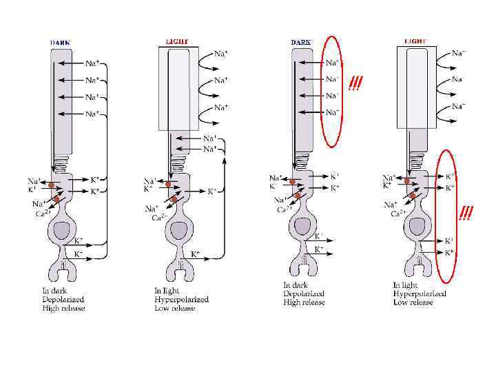 Photocurrent (decrease of “dark current”) Hyperpolarization Circulating current (“dark current”) in a Rod
