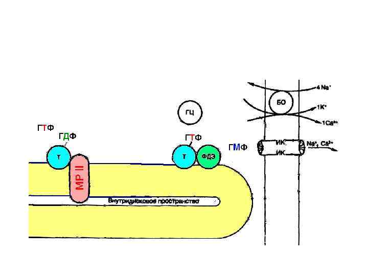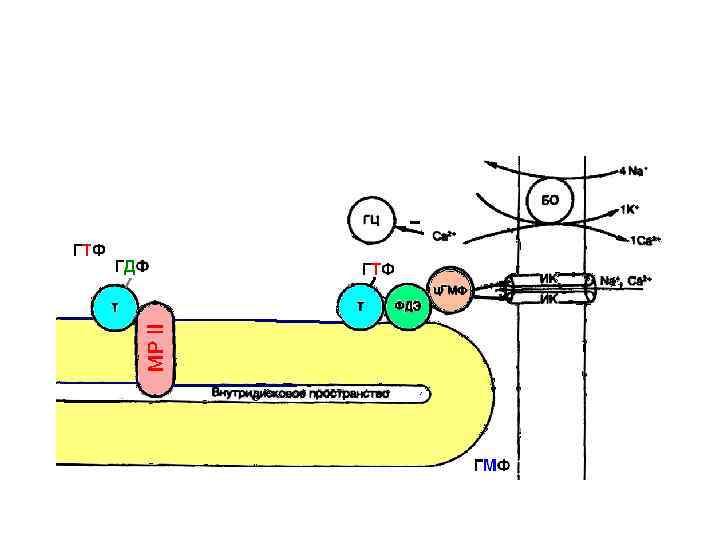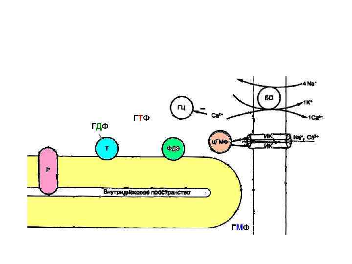 Рис. 14. 7. Фотохимические процессы в палочковом аппарате сетчатки. С. 217 А — фрагмент фоторецепторного диска; Б — ионные токи через наружную мембрану палочки в темноадаптированном состоянии. Р — молекула родопсина; Р' — молекула родопсина в фоторецепторной мембране диска; М — метародопсин II; БО — белок-обменник; ИК — ионный канал; Т — трансдуцин; ФДЭ — фосфодиэстераза; ГЦ — гуанилатциклаза; ц. ГМФ — циклический гуанозиимонофосфат; ГМФ — гуанозинфонофосфат; ГДФ — гуанозиндифосфат; ГТФ — гуанозинтрифосфат; Д — диск; СН — соединительная ножка; ЯЧ — ядерная часть; ПП — пресинаптические пузырьки; НС — наружный сегмент; ВС — внутренний сегмент; ПСК — пресинаптический комплекс; Я — ядро.