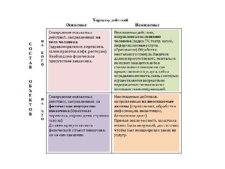 Действия, которые сегодня согласно статистике относятся к классу услуг, довольно разнообразны: Они направлены на разные объекты, имеют различную целевую аудиторию, чувствительность к продвижению, эластичность спроса по цене, различаются по степени осязаемости, возможности транспортировки и хранения. Исполнение одних услуг зависит в большей степени от использования технологических разработок и изобретений, других — от таланта и мастерства того, кто оказывает услугу, и т. п. Существующие классификации фиксируют услуги по мере их появления, но не предлагают возможности разделения их по типам. Например, одним из таких критериев могло бы стать наличие элементов процесса производства при выполнении услуг. Такая типологизация была бы важна при разработке маркетинговой стратегии.