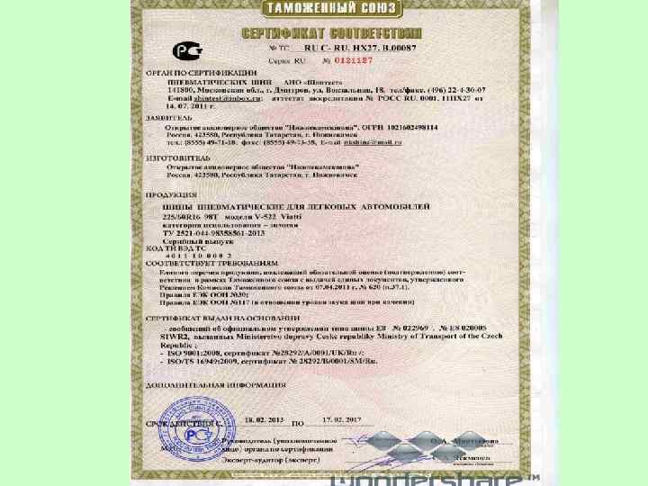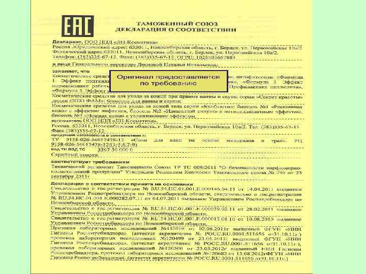 Содержание информации о продукции в документах № п/п Содержание информации Сертификат соответствия Декларация о соответствии 1 Наименование и местонахождение заявителя + + 2 Наименование и изготовителя продукции местонахождение + + 3 Наименование и местонахождение органа по сертификации, выдавшего сертификат + — 4 Информация об объекте сертификации или декларирования, позволяющая его идентифицировать + + 5 Наименование технического регламента + + 6 Информация о проведенных испытаниях, сертификате системы качества и других документах + + 7 Указание на схему декларирования - + 8 Заявление заявителя о безопасности продукции - + 9 Срок действия декларации или сертификата + +