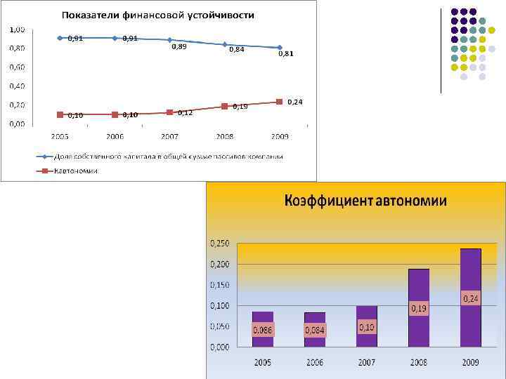 Показатели финансовой устойчивости Наименование показателей 2005 2006 2007 2008 2009 Доля собственного капитала в общей сумме пассивов 92, 1 92, 2 90, 9 84, 1 80, 8 0, 08 0, 10 0, 19 0, 24 0, 02 0, 004 -0, 02 -0, 04 -0, 05 0, 27 0, 076 -0, 295 -0, 448 -0, 699 Кавтономии Кманевр. Доля собственных источников финансирования оборотного капитала компании