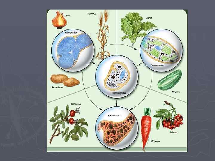 ПЛАСТИДЫ Содержатся только в растительных тканях. ТИПЫ ПЛАСТИД ЛЕЙКОПЛАСТЫ • Бесцветные так как не содержат пигментов. • Содержатся в семенах, клубнях. • Запасают крахмал ХРОМОПЛАСТЫ • Окрашенные т. к. содержат пигменты (каротин). • Находятся в клетках цветов, плодов, листьях. • Придают привлекающий насекомых цвет, накапливают продукты жизнедеятельности растения ХЛОРОПЛАСТЫ • Зеленые, т. к содержат пигмент хлорофилл. • Содержатся в зеленых органах растений. • В них осуществляется процесс фотосинтеза