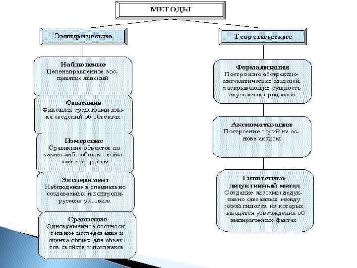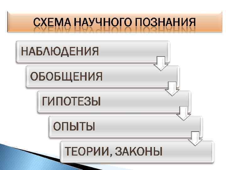 Уровни научного познания Эмпирический уровень – отражение внешних признаков, сторон связей Получение эмпирических фактов, их описание и систематизация Теоретический уровень – Объяснение фактов. Отражение существенных связей, открытие законов Систематизация знаний. Формирование научных теорий