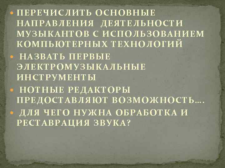 ПЕРЕЧИСЛИТЬ ОСНОВНЫЕ НАПРАВЛЕНИЯ ДЕЯТЕЛЬНОСТИ МУЗЫКАНТОВ С ИСПОЛЬЗОВАНИЕМ КОМПЬЮТЕРНЫХ ТЕХНОЛОГИЙ НАЗВАТЬ ПЕРВЫЕ ЭЛЕКТРОМУЗЫКАЛЬНЫЕ ИНСТРУМЕНТЫ НОТНЫЕ РЕДАКТОРЫ ПРЕДОСТАВЛЯЮТ ВОЗМОЖНОСТЬ…. ДЛЯ ЧЕГО НУЖНА ОБРАБОТКА И РЕСТАВРАЦИЯ ЗВУКА?