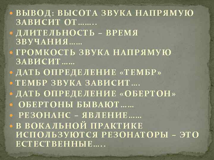 ВЫВОД: ВЫСОТА ЗВУКА НАПРЯМУЮ ЗАВИСИТ ОТ……. . ДЛИТЕЛЬНОСТЬ – ВРЕМЯ ЗВУЧАНИЯ…… ГРОМКОСТЬ ЗВУКА НАПРЯМУЮ ЗАВИСИТ…… ДАТЬ ОПРЕДЕЛЕНИЕ «ТЕМБР» ТЕМБР ЗВУКА ЗАВИСИТ…. ДАТЬ ОПРЕДЕЛЕНИЕ «ОБЕРТОН» ОБЕРТОНЫ БЫВАЮТ…… РЕЗОНАНС – ЯВЛЕНИЕ…… В ВОКАЛЬНОЙ ПРАКТИКЕ ИСПОЛЬЗУЮТСЯ РЕЗОНАТОРЫ – ЭТО ЕСТЕСТВЕННЫЕ…. .