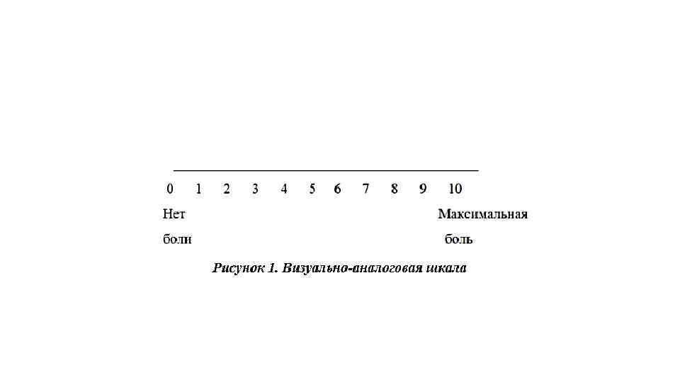 ВАШ • Оценка интенсивности хронической боли должна производиться при помощи специальной визуальной аналоговой шкалы (далее – ВАШ): линейка длиной 10 см, градуированную слева направо от отметки «Нет боли» до отметки «Невыносимая боль» • Наиболее часто применяется вариант шкалы, построенный в виде линейки – где на стороне, обращаемой к пациенту, на шкале отсутствуют деления, а оставлены только вышеупомянутые обозначения. Пациенту предлагается указать точку на шкале, соответствующую его болевым ощущениям. • На стороне линейки, обращенной к врачу, имеется градуированная от 0 до 10 шкала, позволяющая количественно фиксировать интенсивность хронической боли для последующего контроля эффективности лечения.