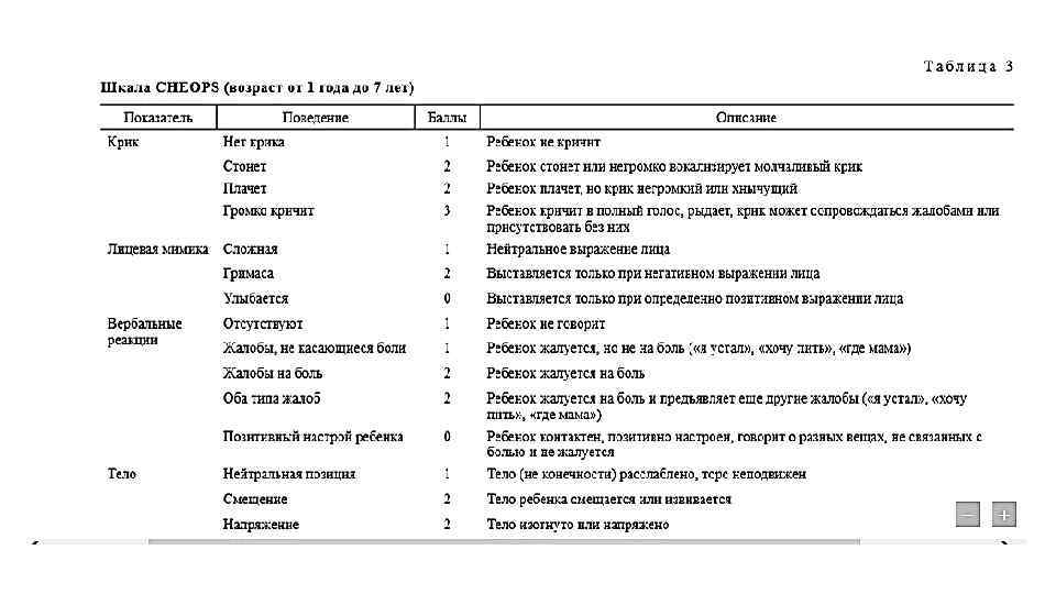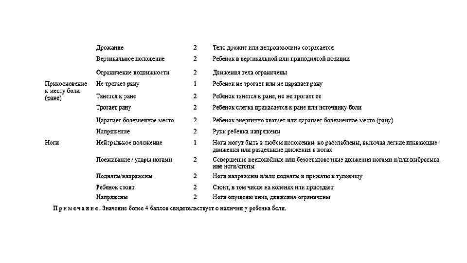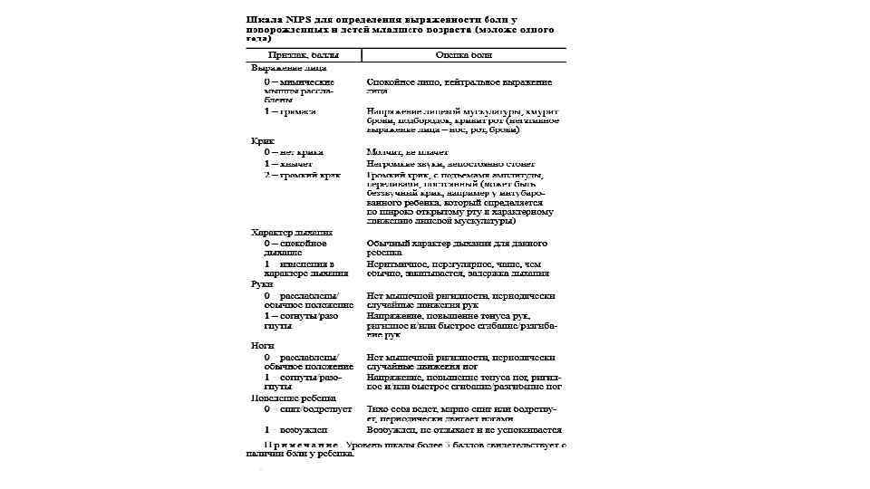 • Шкала COMFORT сложна в применении и требует достаточного навыка для разделения описываемых различий в поведении ребенка или определения физиологических показателей: например, уровень артериального давления сравнивается со средними нормами, а также учитывается частота его повышения в течение суток. • В то же время нет убедительных данных о преимуществах той или иной шкалы для оценки болевого синдрома.