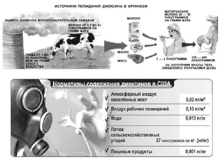 Диоксины Во внешней среде • абсорбируются на орг. , пылевых и аэрозольных частицах, разносятся воздушными потоками, поступают в водные экосистемы, • в донных отложениях м. сохраняться десятки лет, • в почве возможна медленная микробная деградация. Поступление в организм человека: • ежесуточное ПДП диоксина в организм человека в разных странах от 1 до 200 пг/кг. В организме • подвергаются медленной биотрансформации. • значительная часть накапливается в жировой ткани. • T 1/2 : у мышей – 15 дн. ; крыс - 30; обезьян - 455; у человека - 5 -7 лет