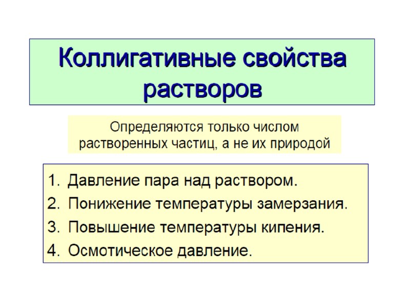 Следствия закона Рауля Любая жидкость закипает, когда давление пара становится равным атмосферному давлению. Замерзает раствор, когда давление водяного пара над раствором становится равным давлению пара над твердым растворителем – льдом. Растворы кипят при более высоких температурах Ткип = Ткип(р-ра) - Ткип(р-ля), а замерзают при более низких Тзам = Тзам(р-ля) - Тзам(р-ра)