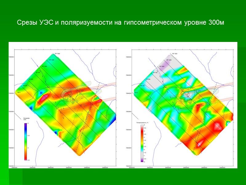 Срезы УЭС и поляризуемости на гипсометрическом уровне 300м
