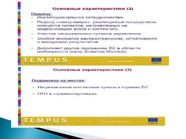 • Высшее образование и общество • развитие партнерств с предприятиями • образование - инновации - исследования • обучение для госслужащих (сотрудников министерств, региональных органов управления образованием, местных властей и т. п. ) • развитие обучения в течение всей жизни • рамки квалификаций Российские приоритеты для Структурных мер • Реформа управления • совершенствование управления учебными заведениями и студенческие службы • внедрение систем обеспечения качества • развитие институциональной и финансовой автономии • обеспечение равного и прозрачного доступа к высшему образованию • развитие международных отношений • Высшее образование и общество • развитие партнерств с предприятиями • образование - инновации - исследования • обучение для госслужащих (сотрудников министерств, региональных органов управления образованием, местных властей и т. п. ) • развитие обучения в течение всей жизни РАЗМЕР ГРАНТА = 500 000 – 1 500 000 ЕВРО ДЛЯ СОВМЕСТНЫХ ПРОЕКТОВ И СТРУКТУРНЫХ МЕР. • рамки квалификаций МИНИМАЛЬНОЕ СОФИНАНСИРОВАНИЕ: 10% ПРОДОЛЖИТЕЛЬНОСТЬ ПРОЕКТА 24 ИЛИ 36 МЕСЯЦЕВ