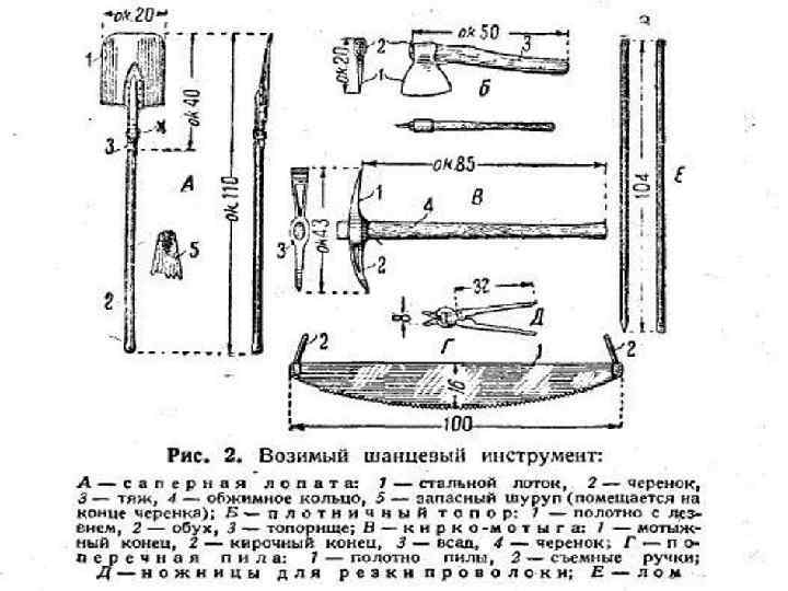 Лом обыкновенный. Предназначен для рыхления особо твердых грунтов, пробивания отверстий во льду, бетонных перекрытиях, каменной кладке, разборки завалов, разъединения деревянных конструкций, а также в качестве рычага при грузоподъемных работах. Металлический стержень из легированной стойкой к истириранию стали. Один конец заточен четырехгранником, второй сделан лопаточкой. Успех работы ломом зависит от умения правильно подготовить его. Тело лома должно быть отпущено, а рабочие концы закалены. Только в этом случае лом не будет отсушивать руки при ударах, вибрировать и в то же время не тупиться слишком быстро. Как табельный инструмент имеется только в инженерных подразделениях и в качестве инструмента ЗИПа артиллерийских орудий. Пила поперечная двухручная. Предназначена для поперечной распиловки деревянных элементов, валки леса. Входит в состав ЗИПа всех боевых и большинства небоевых машин, а также входит в состав табельного шанцевого инструмента подразделений мотострелковых, танковых, инженерных войск, артиллерии. Успех работы зависит от правильности разводки и заточки зубьев. При правильно выставленных этих параметрах и минимальном навыке пилющих эта пила способна распиливать лес любой твердости с высокой производительностью (на 10 перепилов сырого бревна соснового диаметром 32 см. требуется 30 -35 мин. ).