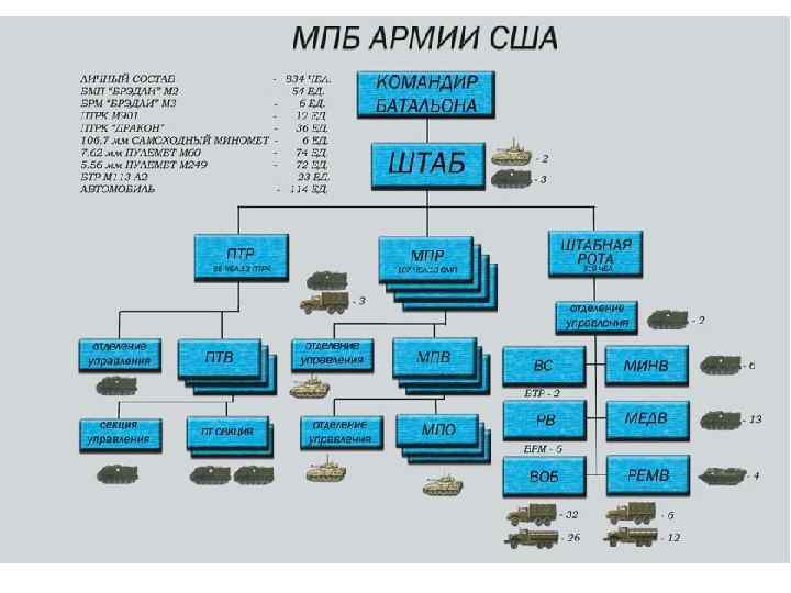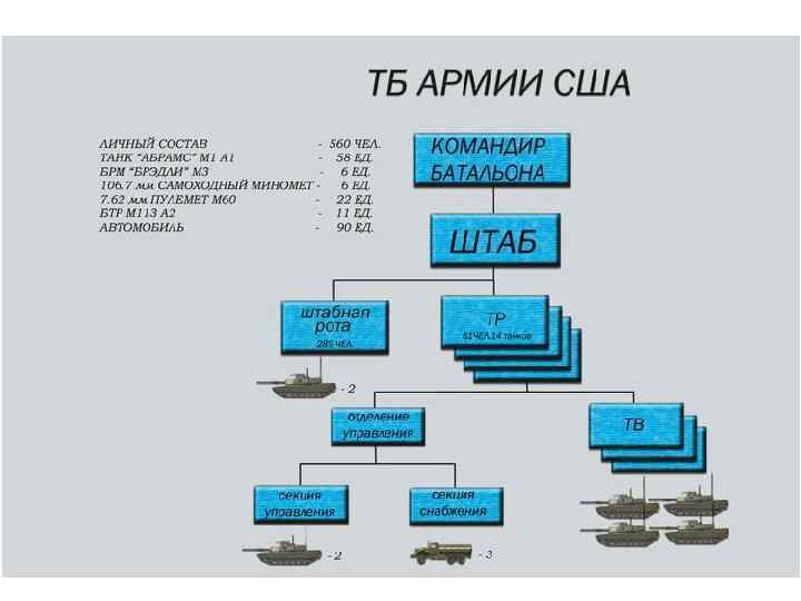 Танковый батальон армии США Танковый батальон (тб), входящий в состав механизированной и бронетанковой дивизий однотипны. Организационно танковый батальон состоит из командования, штаба, штабной и четырех танковых рот.