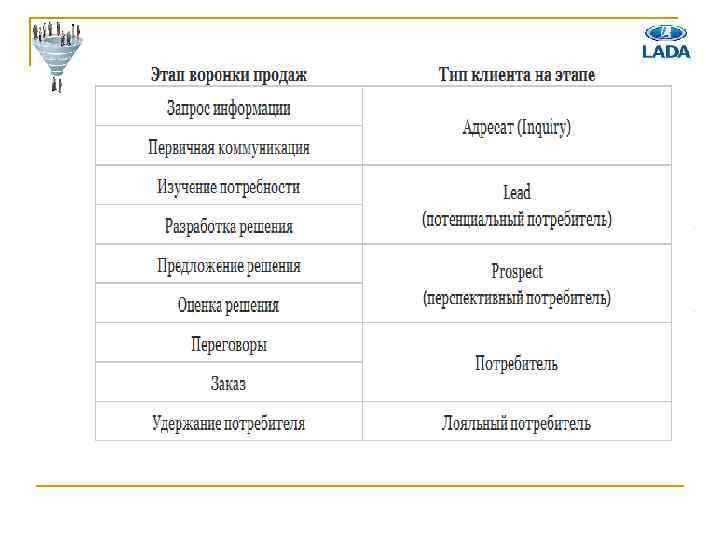 Классические этапы «воронки продаж» 1. 2. 3. 4. 5. 6. Потенциальные клиенты (unqualified leads/prospects). Потенциальные клиенты, с которыми был произведён первый контакт (opportunity size). Заинтересованные потенциальные клиенты (qualified leads). Клиенты в процессе обсуждения цены. Клиенты в процессе подписания договора. Клиенты, заплатившие деньги.