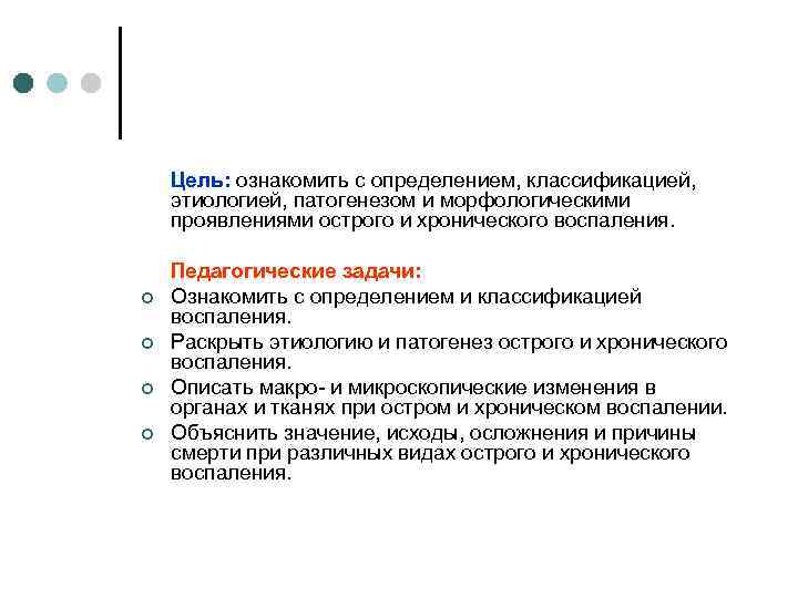 Цель: ознакомить с определением, классификацией, этиологией, патогенезом и морфологическими проявлениями острого и хронического воспаления. Педагогические задачи: ¢ Ознакомить с определением и классификацией воспаления. ¢ Раскрыть этиологию и патогенез острого и хронического воспаления. ¢ Описать макро- и микроскопические изменения в органах и тканях при остром и хроническом воспалении. ¢ Объяснить значение, исходы, осложнения и причины смерти при различных видах острого и хронического воспаления.