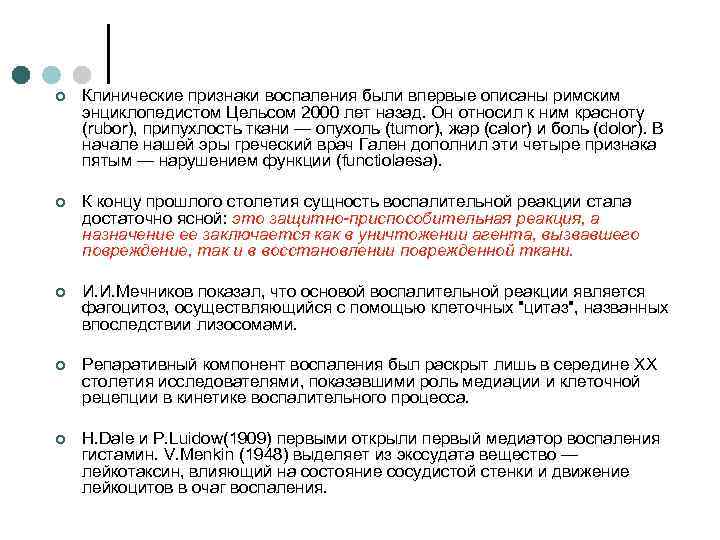 ¢ Клинические признаки воспаления были впервые описаны римским энциклопедистом Цельсом 2000 лет назад. Он относил к ним красноту (rubor), припухлость ткани — опухоль (tumor), жар (calor) и боль (dolor). В начале нашей эры греческий врач Гален дополнил эти четыре признака пятым — нарушением функции (functiolaesa). ¢ К концу прошлого столетия сущность воспалительной реакции стала достаточно ясной: это защитно-приспособительная реакция, а назначение ее заключается как в уничтожении агента, вызвавшего повреждение, так и в восстановлении поврежденной ткани. ¢ И. И. Мечников показал, что основой воспалительной реакции является фагоцитоз, осуществляющийся с помощью клеточных "цитаз", названных впоследствии лизосомами. ¢ Репаративный компонент воспаления был раскрыт лишь в середине XX столетия исследователями, показавшими роль медиации и клеточной рецепции в кинетике воспалительного процесса. ¢ H. Dale и P. Luidow(1909) первыми открыли первый медиатор воспаления гистамин. V. Menkin (1948) выделяет из экссудата вещество — лейкотаксин, влияющий на состояние сосудистой стенки и движение лейкоцитов в очаг воспаления.