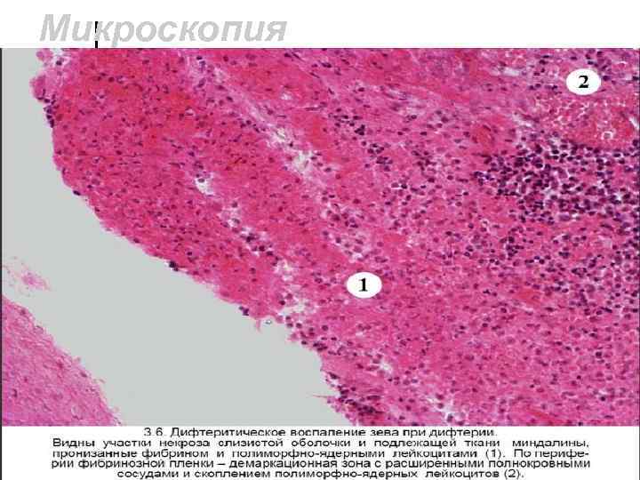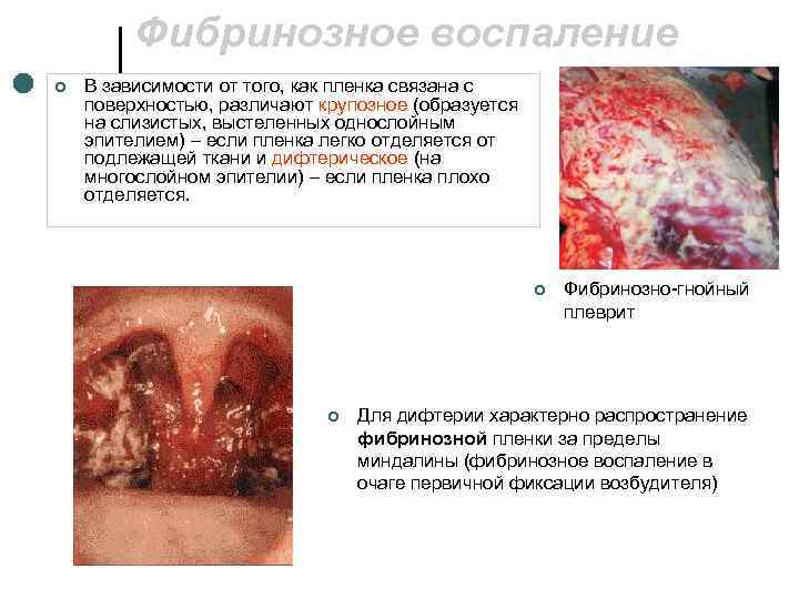 Фибринозное воспаление ¢ В зависимости от того, как пленка связана с поверхностью, различают крупозное (образуется на слизистых, выстеленных однослойным эпителием) – если пленка легко отделяется от подлежащей ткани и дифтерическое (на многослойном эпителии) – если пленка плохо отделяется. ¢ Фибринозно-гнойный плеврит ¢ Для дифтерии характерно распространение фибринозной пленки за пределы миндалины (фибринозное воспаление в очаге первичной фиксации возбудителя)