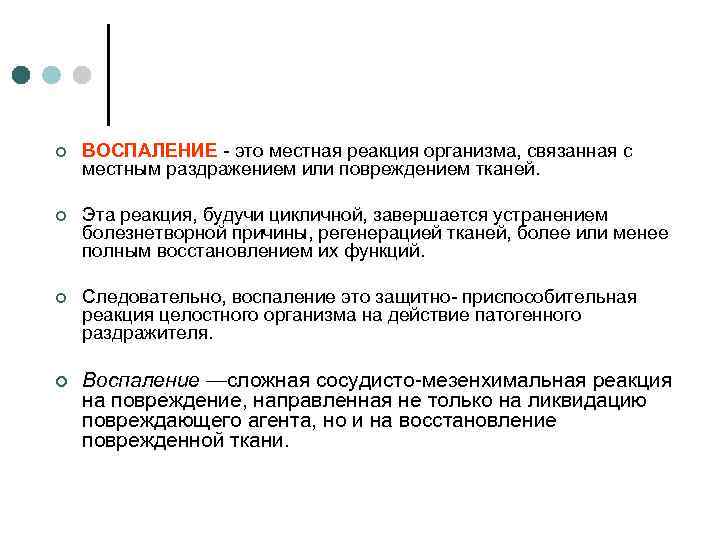 ¢ ВОСПАЛЕНИЕ - это местная реакция организма, связанная с местным раздражением или повреждением тканей. ¢ Эта реакция, будучи цикличной, завершается устранением болезнетворной причины, регенерацией тканей, более или менее полным восстановлением их функций. ¢ Следовательно, воспаление это защитно- приспособительная реакция целостного организма на действие патогенного раздражителя. ¢ Воспаление —сложная сосудисто-мезенхимальная реакция на повреждение, направленная не только на ликвидацию повреждающего агента, но и на восстановление поврежденной ткани.