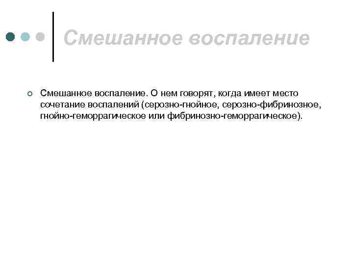 Смешанное воспаление ¢ Смешанное воспаление. О нем говорят, когда имеет место сочетание воспалений (серозно-гнойное, серозно-фибринозное, гнойно-геморрагическое или фибринозно-геморрагическое).