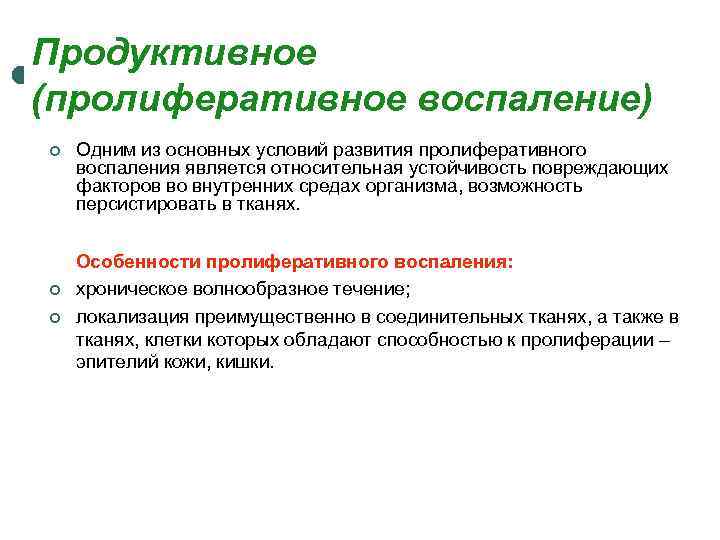 Продуктивное (пролиферативное воспаление) ¢ Одним из основных условий развития пролиферативного воспаления является относительная устойчивость повреждающих факторов во внутренних средах организма, возможность персистировать в тканях. Особенности пролиферативного воспаления: ¢ хроническое волнообразное течение; ¢ локализация преимущественно в соединительных тканях, а также в тканях, клетки которых обладают способностью к пролиферации – эпителий кожи, кишки.