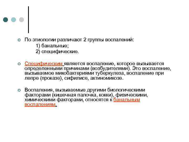 ¢ По этиологии различают 2 группы воспалений: 1) банальные; 2) специфические. ¢ Специфическим является воспаление, которое вызывается определенными причинами (возбудителями). Это воспаление, вызываемое микобактериями туберкулеза, воспаление при лепре (проказе), сифилисе, актиномикозе. ¢ Воспаления, вызываемые другими биологическими факторами (кишечная палочка, кокки), физическими, химическими факторами, относятся к банальным воспалениям.