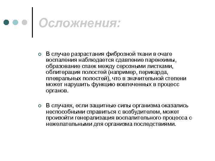 Осложнения: ¢ В случае разрастания фиброзной ткани в очаге воспаления наблюдается сдавление паренхимы, образование спаек между серозными листками, облитерация полостей (например, перикарда, плевральных полостей), что в значительной степени может нарушить функцию вовлеченных в процесс органов. ¢ В случаях, если защитные силы организма оказались неспособными справиться с возбудителем, может произойти генерализация воспалительного процесса с нежелательными для организма последствиями.