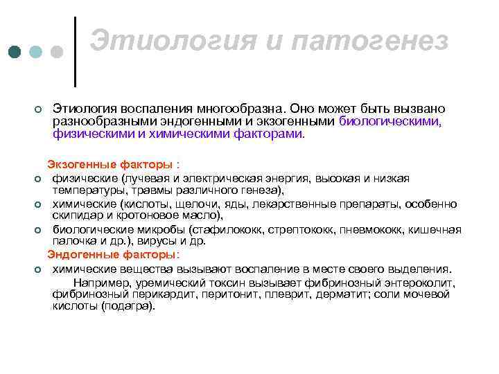 Этиология и патогенез ¢ Этиология воспаления многообразна. Оно может быть вызвано разнообразными эндогенными и экзогенными биологическими, физическими и химическими факторами. Экзогенные факторы : ¢ физические (лучевая и электрическая энергия, высокая и низкая температуры, травмы различного генеза), ¢ химические (кислоты, щелочи, яды, лекарственные препараты, особенно скипидар и кротоновое масло), ¢ биологические микробы (стафилококк, стрептококк, пневмококк, кишечная палочка и др. ), вирусы и др. Эндогенные факторы: ¢ химические вещества вызывают воспаление в месте своего выделения. Например, уремический токсин вызывает фибринозный энтероколит, фибринозный перикардит, перитонит, плеврит, дерматит; соли мочевой кислоты (подагра).