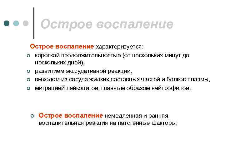 Острое воспаление характеризуется: ¢ короткой продолжительностью (от нескольких минут до нескольких дней), ¢ развитием экссудативной реакции, ¢ выходом из сосуда жидких составных частей и белков плазмы, ¢ миграцией лейкоцитов, главным образом нейтрофилов. ¢ Острое воспаление немедленная и ранняя воспалительная реакция на патогенные факторы.