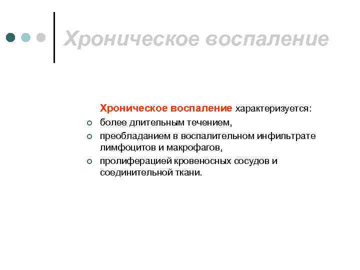 Хроническое воспаление Хроническое воспаление характеризуется: ¢ более длительным течением, ¢ преобладанием в воспалительном инфильтрате лимфоцитов и макрофагов, ¢ пролиферацией кровеносных сосудов и соединительной ткани.