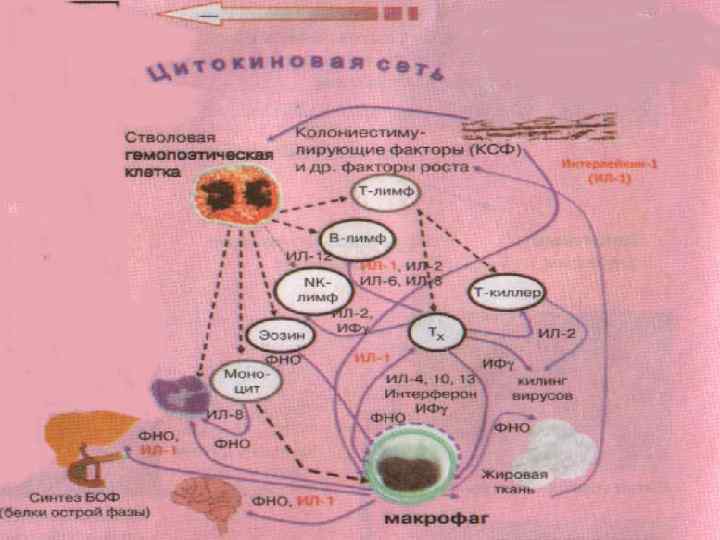 Основные механизмы развития «острофазной реакции» 1. Экспрессия и выделение цитокинов; 2. Взаимодействие цитокинов с рецепторами (преформированными и экспрессированными; 3. Синтез и выделение клетками разнообразных БАВ (простагландинов, белков острой фазы, лейкотриенов, биооксиданотов…).