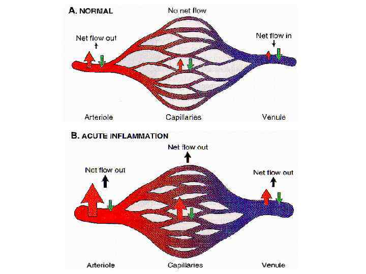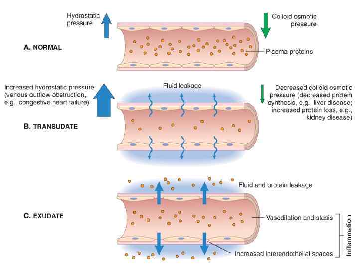Механизмы экссудации Норма Воспаление Сокращение эндотелиоцитов Повышенное осмотическое и онкотическое давление Повышенное гидростатическое давление Трансцитоз Частичная деградация базальной мембраны