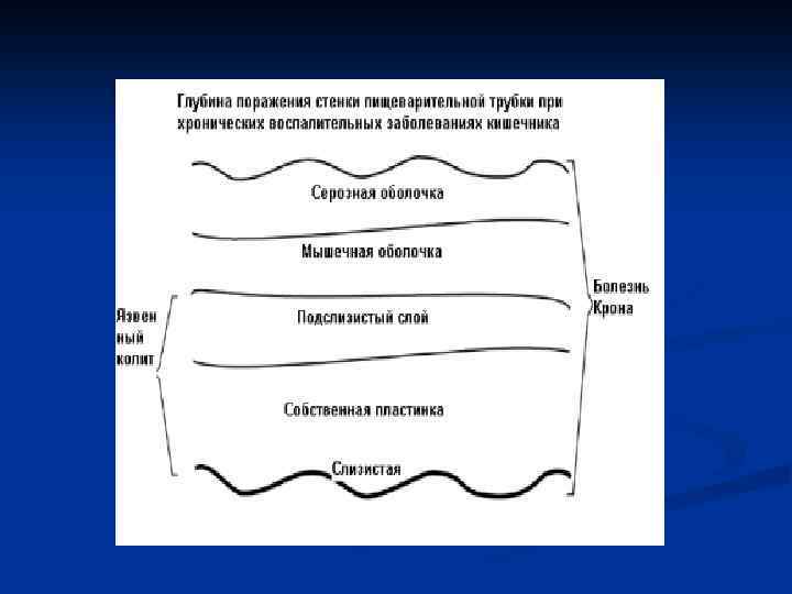 n n НЯК неспецифическое иммунное воспаление в пределах слизистой оболочки толстой кишки Поражение только толстой кишки ( исключая случаи ретроградного илеита); Обязательное вовлечение в процесс прямой кишки; Диффузный характер воспаления n n n Болезнь Крона неспецифическое гранулематозное трансмуральное воспаление Поражение любой зоны ЖКТ Регионарный характер воспаления