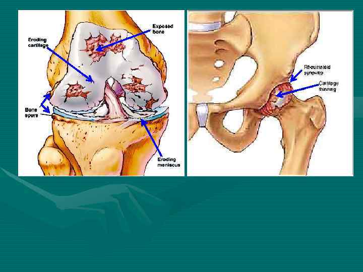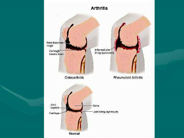 Схема, отражающая различия между нормальным суставом, пораженным остеоартритом и ревматодиным артритом. .