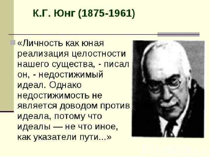 КАРЛ ГУСТАВ ЮНГ. • Структура личности (эго, личное бессознательное и его комплексы, коллективное бессознательное и его архетипы) • Центр личности – самостоятельность • Интенция (направленность) активности • интроверсия (внутрь себя) • экстраверсия (вне, • на окружающий мир).