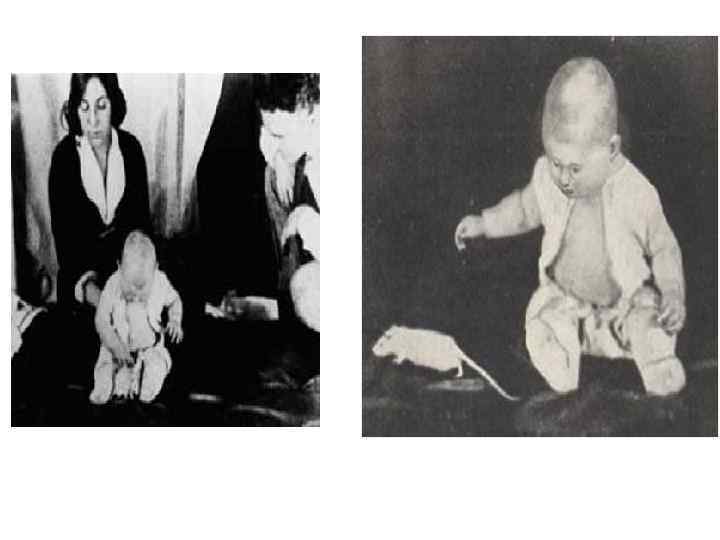 Крошка Альберт (1920 год) • Джон Уотсон, отец бихевиористского направления в психологии, занимался исследованиями природы страхов и фобий. • Изучая эмоции младенцев, Уотсон, среди прочего, заинтересовался возможностью формирования реакции страха применительно к объектам, которые ранее страх не вызывали. • Ученый проверил возможность формирования эмоциональной реакции боязни белой крысы у 9 -месячного мальчика Альберта, который крысу совсем не боялся и даже любил с ней играть. Уотсон предположил, что очень многие страхи, антипатии и тревожные состояния взрослых формируются еще в раннем детстве. • К концу эксперимента ( 2 месяцев), к сожалению, Уотсону так и не удалось избавить малыша Альберта от его беспричинного страха, который закрепился на всю оставшуюся жизнь.