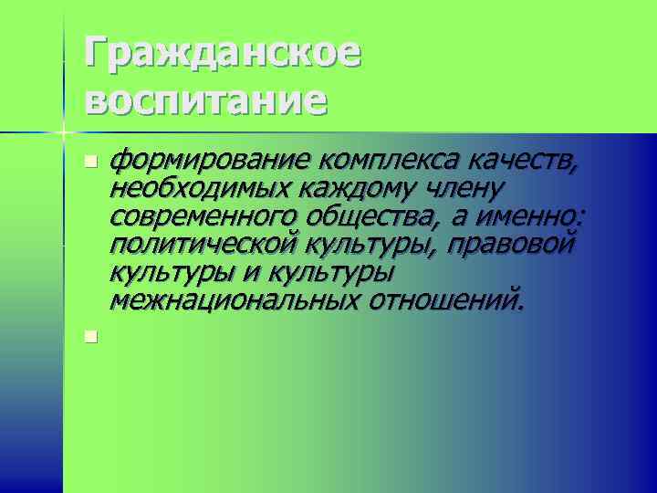 Гражданское воспитание n n формирование комплекса качеств, необходимых каждому члену современного общества, а именно: политической культуры, правовой культуры и культуры межнациональных отношений.