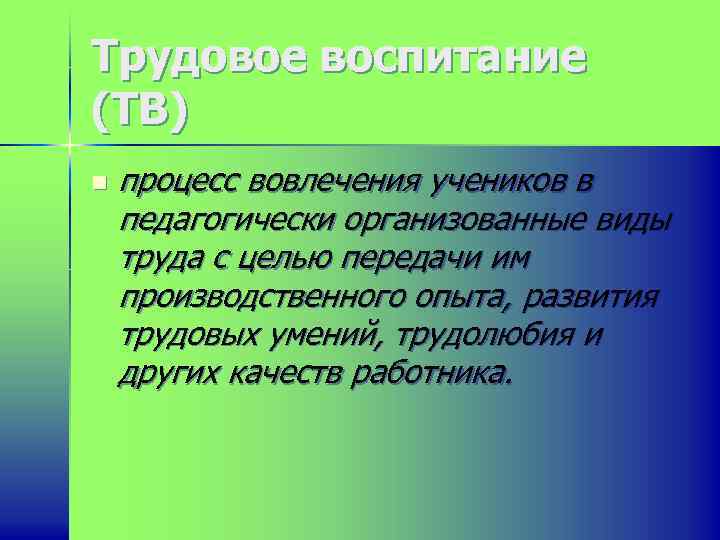 Трудовое воспитание (ТВ) n процесс вовлечения учеников в педагогически организованные виды труда с целью передачи им производственного опыта, развития трудовых умений, трудолюбия и других качеств работника.