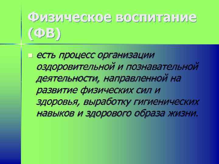 Физическое воспитание (ФВ) n есть процесс организации оздоровительной и познавательной деятельности, направленной на развитие физических сил и здоровья, выработку гигиенических навыков и здорового образа жизни.