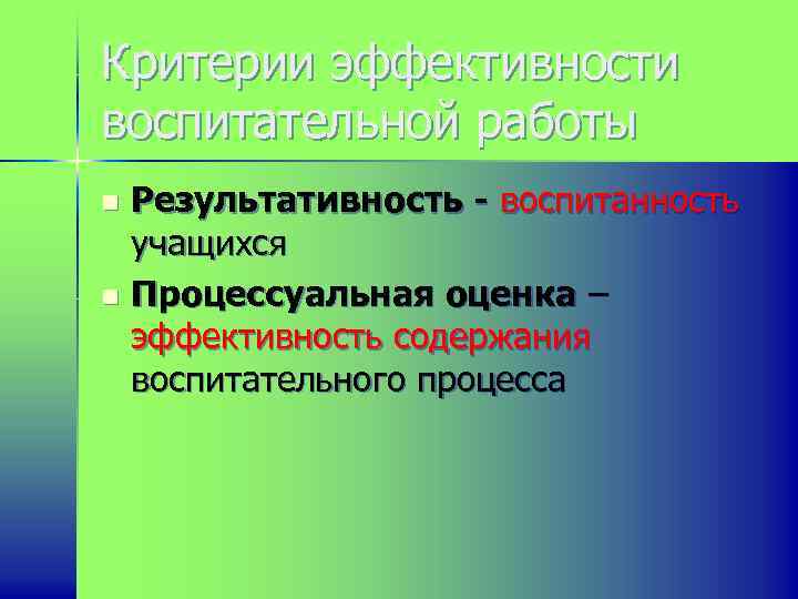 Критерии эффективности воспитательной работы Результативность - воспитанность учащихся n Процессуальная оценка – эффективность содержания воспитательного процесса n