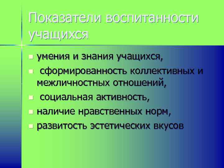 Показатели воспитанности учащихся умения и знания учащихся, n сформированность коллективных и межличностных отношений, n социальная активность, n наличие нравственных норм, n развитость эстетических вкусов n